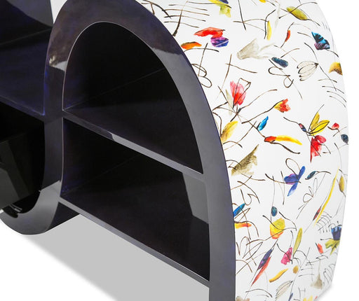 Illusions Collection by Aico Furniture Hand-crafted High gloss lacquer Hand-painted frame 3 Level shelving 1 Drawer
