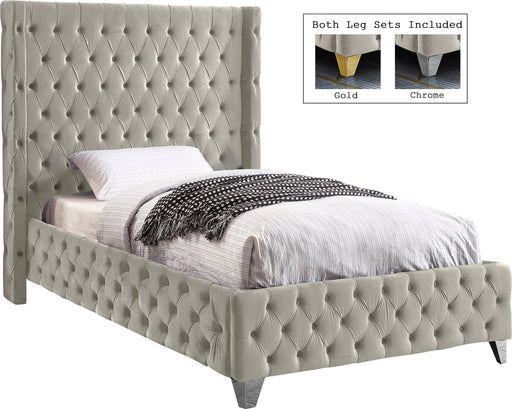 Savan Grey Velvet Twin Bed - Rich Grey Velvet - Deep Button Tufting - Gold and Chrome Legs Included with Each Bed - Full Slats (No Box Spring R...