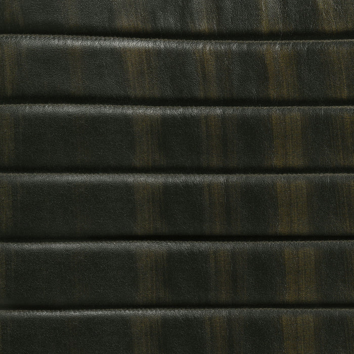 With a hint of ranch inspiration, the design of this five-piece counter height dining set is a brilliant choice for an easy, casual living space. Indulge in a calm vibe with a set anchored by a natural finish sheesham table featuring a spacious rectangular top and tapered, rounded legs. A dark apron with geometric design detail adds an exotic effect. Mid-Century Modern influence adds to four comfortable counter stools with scoop seats and a thick back, both with horizontally channeled leather upholstery. Metal framing features iconic retro slender rounded, splayed legs.