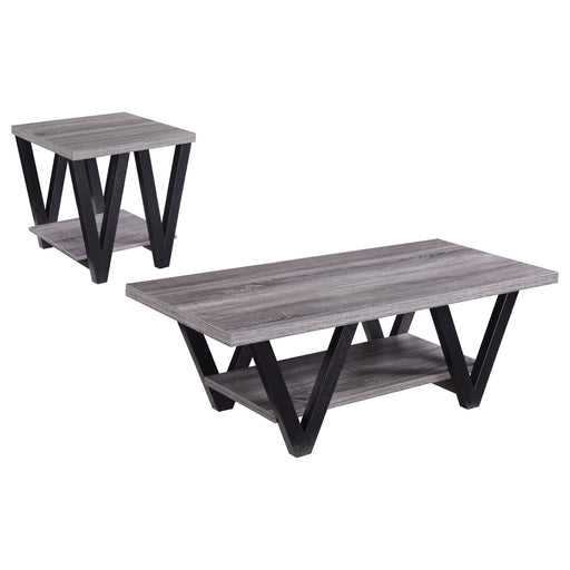 This modern end table combines style and functionality, perfect for contemporary living spaces. The square grey wood-look top and lower shelf, crafted from engineered wood with a durable laminate veneer, provide ample surface area and storage. Black "V"-shaped legs offer striking visual contrast and robust support. Its compact size and additional storage shelf make this side table a practical and elegant choice for your living room or seating area.