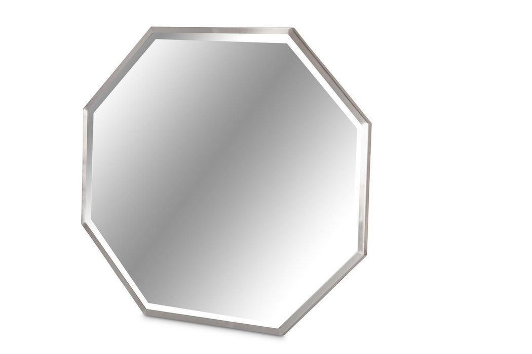 • Octagonal mirror frame is made with stainless steel in a brushed nickel finish