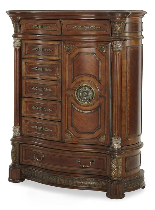 Villa Valencia Collection by Aico Furniture Classic Chestnut Finish Crafted from Birch solids Multi-faceted beveled glass encasements