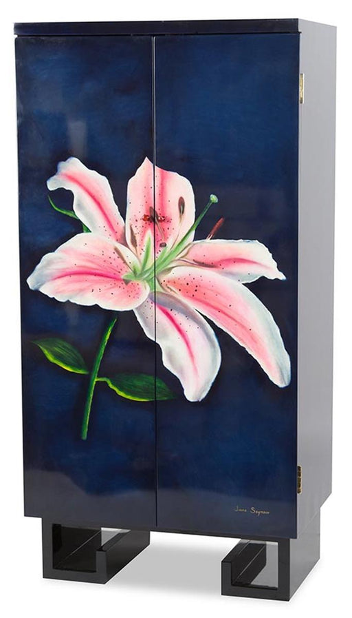 Illusions Collection by Aico Furniture Hand-crafted High gloss lacquer Hand-painted frame Floral art 2 Doors Large compartments 2 Drawers Wine rac...